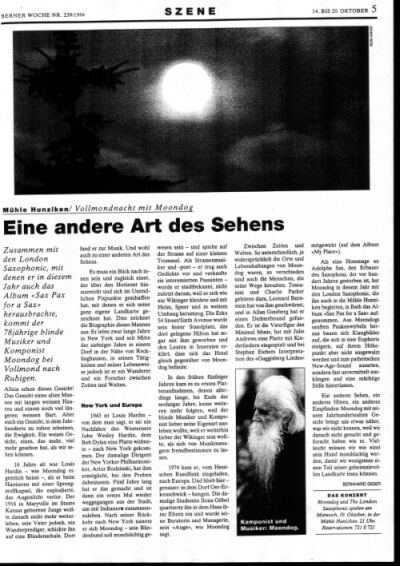 Als eine Hommage an Adolphe Sax, den Erbauer des Saxophons, der vor hundert Jahren gestorben ist, hat Moondog in diesem Jahr mit den London Saxophonic, die ihn auch in die Mühle Hunziken begleiten, in Bath das Album "Sax Pax for a Sax" aufgenommen. Aus Moondogs sanften Paukenwirbeln heraus bauen sich Klangbilder auf, die sich in eine Euphorie steigern, auf ihrem Höhepunkt aber nicht ausgewalzt werden und zum pathetischen New-Age-Sound ausarten, sondern fast unvermittelt ausklingen und eine mächtige Stille hinterlassen.