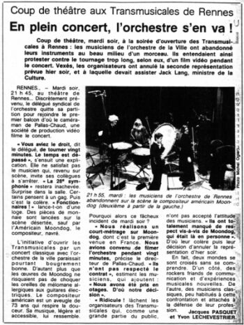 "Vous aviez le droit, dit le délégué, de tourner vingt minutes. Le temps est dépassé", s'ensuit une explication. Elle ne satisfait pas le musicien qui, revenu sur scène, invite ses collègues à s'arrêter. "La 28e symphonie" restera inachevée. Surprise dans la salle. Certains pensent à un gag. Puis c'est la colère. "Fonctionnaires!" lance-t-on d'une loge. Des pièces de monnaie sont lancées sur la scène désertée, sauf par l'Américain Moondog, le compositeur, navré.