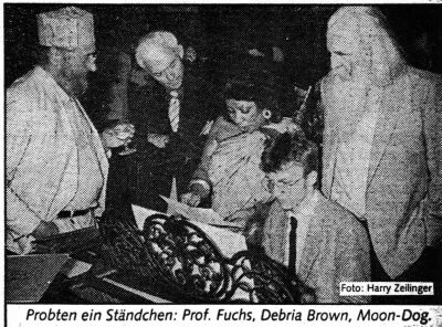 Viel Prominenz drückte sich Freitag abend in der Villa Schmederer im Salzburger Nobelviertel Parsch die Türklinke in die Hand; gab es doch die Möglichkeit, Moon-Dog, einen der Vorreiter der psychodelisch-elektronischen Musik, kennenzulernen. Professor Ernst Fuchs stellte den amerikanischen Komponisten anhand von Musikbeispielen vor. Ebenfalls gesichtet: Opernstar Debria Browne, Helmut Lohner samt Gattin und Arik Brauer.