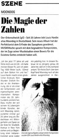 Oer-Erkenschwick (gil) - Seit 20 Jahren lebt Louis Hardin alias Moondog in Deutschland. Sein neues Album hat der Perfektionist dem Erfinder des Saxophons gewidmet. MUSIKWoche sprach mit dem begnadeten Komponisten, der im Zuge seiner Musikstudien einen Beweis für die Existenz Gottes entdeckt haben will.