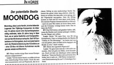 Moondog, alias Louis Hardin, ist eine lebende Legende: Der 73jährige Komponist, im Alter von 16 Jahren durch eine Dynamitexplosion völlig erblindet, lebte 30 Jahre lang in New York, wo er seine Gedichte und Kompositionen auf der 6th Avenue verkaufte. Seit 1975 arbeitete er im Ruhrgebiet, doch erst jetzt bahnt sich die Wiederentdeckung des Künstlers an - eine CD-Box mit älteren Aufnahmen wurde gerade wiederveröffentlicht.