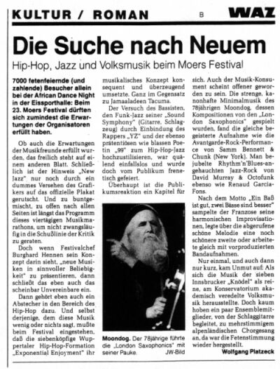 Überhaupt ist die Publikumsreaktion ein Kapitel für sich. Auch der Musik-Konsument scheint offener geworden zu sein. Die strenge, kanonhafte Minimalmusik des 78jährigen Moondog, dessen Kompositionen von den "London Saxophonics" gespielt wurden, fand die gleiche begeisterte Aufnahme wie die Avantgarde-Rock-Performance von Samm Bennett & Chunk (New York). Man bejubelte Rhythm'n'Blues-angehauchten Jazz-Rock von David Murray & Octofunk ebenso wie Renaud Garcia-Fons.