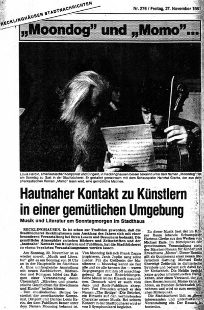 Louis Hardin, amerikanischer Komponist und Dirigent, in Recklinghausen besser bekannt unter dem Namen "Moondog", ist am Sonntag zu Gast in der Stadtbücherei. Er gestaltet gemeinsam mit dem Schauspieler Hartmut Gierke, der aus dem phantastischen Roman "Momo" lesen wird, eine gemütliche Matinee.