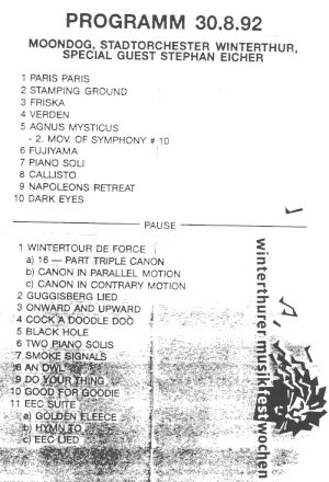 Dass Moondog einen Erfolg landen konnte, war nicht selbstverständlich: Bis letzten Freitag hatte Moondog, dessen musikalische Ideen alle um den Kontrapunkt kreisen, komponiert, und das Stadtorchester, der Schweizer Star Eicher und Moondog konnten nur drei Mal zusammen proben - man merkte es kaum. Neben Eicher traten der bekannte Oboist Henry Schuman und Hans Kennel mit einem Alphorn-Quartett auf.