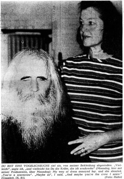 Wir führten ein kleines Interview mit Moondog, der in der Stadt schon Aufsehen erregte, als er mit seinem lila Umhang und seinem Wikinger-Helm auf dem Kopf durch die Straßen marschierte. Moondog fühlt sich hier zu Hause - es sei schon immer sein Wunsch gewesen, in die Heimat seiner Vorfahren zu kommen. Er möchte den Deutschen von der weiterlebenden Tradition der großen Klassiker unter den Musikern berichten, vor allem von Bach, Wagner, Mozart, Haydn.