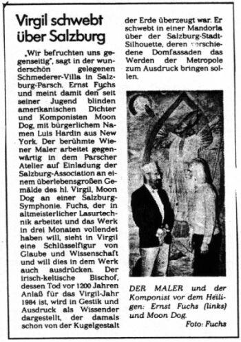 "Wir befruchten uns gegenseitig", sagt in der wunderschön gelegenen Schmederer-ViIla in Salzburg-Parsch Ernst Fuchs und meint damit den seit seiner Jugend blinden amerikanischen Dichter und Komponisten Moon Dog, mit bürgerlichem Namen Luis Hardin aus New York. Der berühmte Wiener Maler arbeitet gegenwärtig in dem Parscher Atelier auf Einladung der Salzburg-Association an einem überlebensgroßen Gemälde des hl. Virgil, Moon Dog an einer Salzburg-Symphonie. Fuchs, der in altmeisterlicher Lasurtechnik arbeitet und das Werk in drei Monaten vollendet haben will, sieht in Virgil eine Schlüsselfigur von Glaube und Wissenschaft und will dies in dem Werk auch ausdrücken. Der irisch-keltische Bischof, dessen Tod vor 1200 Jahren Anlaß für das Virgil-Jahr 1984 ist, wird in Gestik und Ausdruck als Wissender dargestellt, der damals schon von der Kugelgestalt der Erde überzeugt war. Er schwebt in einer Mandorla über der Salzburg-Stadt-Silhouette, deren verschiedene Domfassaden das Werden der Metropole zum Ausdruck bringen sollen.