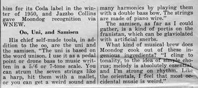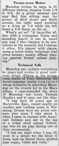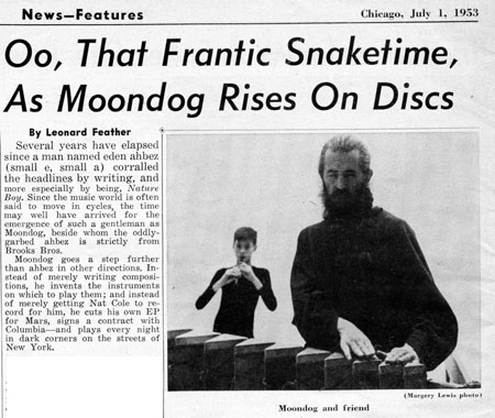 Moondog goes a step further than ahbez in other directions. Instead of merely writing compositions, he invents the instruments on which to play them; and instead of merely getting Nat Cole to record for him, he cuts his own EP for Mars, signs a contract with Columbia - and plays every night in the dark corners on the streets of New York.