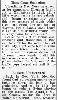 Visualizing New York as a mecca for composers, Moondog finally got to Manhattan in 1943, did a little work posing in art schools, and "began experimenting with this new concept of music which I call snaketime. I'm not fond of slogans, but a dancer heard it and said it sounded snaky. It's an easy name to remember."