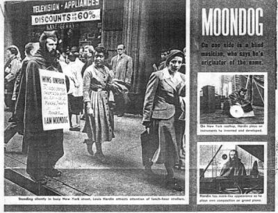Weirdly dressed Hardin is a familiar sight on New York streets. He wears a self-made one-piece, hooded garment, fashioned from material resembling Army blanketing. This he wore to court. There, through his attorneys Hardin informed the judge that under the name of MOONDOG, he had conducted a radio program which featured his own original compositions on records and "mood music".