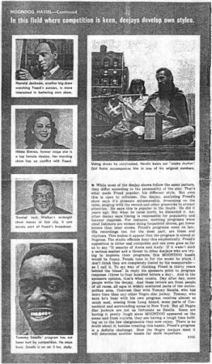 While most of the deejay shows follow the same pattern, they differ according to the personality of the star. That's what made Freed popular, his different style. But even this is open to criticism. One deejay, analysing Freed's show says it's pressure salesmanship, drumming on the table, singing with the record and other gimmicks to attract attention. He says this is popular in the south. He did it years ago. But when he came north, he discarded it. Another deejay says, timing in responsible for popularity and listener response. For instance, morning programs when chief listeners are women doing household chores, get fewer letters than later shows. Freed's programs come on late. His recordings too, for the most part, are blues and rhythms. This makes it appear that the program is aimed at Negroes. The studio officials deny this emphatically. Freed's opposition is bitter and outspoken and one even goes so far as to say "It smacks of Amos and Andy. If it wasn't such a serious matter and a threat to other deejays who are trying to improve their programs, this MOONDOG hassle would he funny. People tune in for the music he plays. I don't think they are completely fooled by his masquerade - as I call it. To my way of thinking Freed is thirty years behind the times." In reply his sponsors point to program response (three to four hundred letters a day). And in the sponsors opinion, that's what counts. Day after day, more people write the deejay. And these letters are from people of all races, all ages in widely scattered parts of the metropolitan area. Contrast that with Tammy Smalls, who has more time than any other Negro disc jockey. Tommy, who says he's busy with his own program receives almost as much mail, coming from Long Island, some parts of Connecticut and surrounding areas in New York. But all Negro disc jockeys are not as fortunate as Smalls. Same are having it pretty rough since MOONDOG appeared on the scene and from reports, they are having a tough time holding on to the few assignments they now enjoy. There is no doubt about it, besides creating this hassle, Freed's program is a definite challenge. How the Negro deejays meet it will determine another hassle far more important.