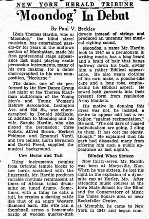 Louis Thomas Hardin, who as 'Moondog', the blind street musician, has entertained passers-by for years in the midtown section of Manhattan, made his first professional stage appearance last night playing exotic percussion instruments, many of his own making, for a dance choreographed to his own composition, _Nocturne".