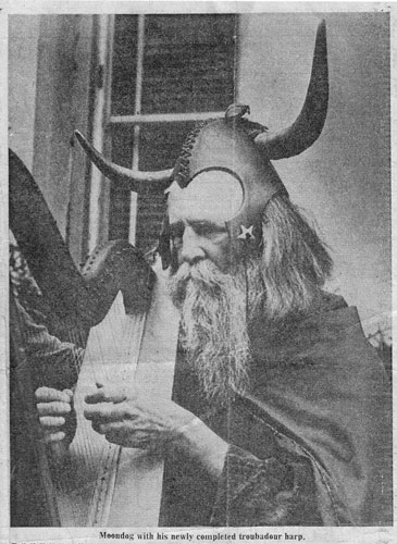 "He stopped at Madison where he had a troubadour harp made for him by a couple of musical instrument makers there." (in: Moondog brings his poetry to campus, by E.J. Birdie, The Marquette Tribune, Milwaukee, Wis., September 20, 1972) |