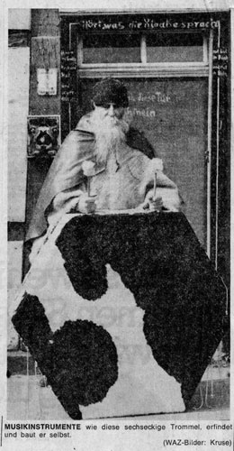 (in: Die Straße gibt ihm die nötige Stimulanz, hol., 6.6.1975 WAZ, Germany) From the Guestbook Archive: willem wittstamm, 13.08.2008 I was happy enough to live with moondog for a while in our Hexenhäuschen in Recklinghausen, leading him to the streets corner where he spent his day reciting and drumming. Quotation: "came to germany to bring you back the drumming". Never forget the big "Hagall-drum" we played on winter solstice. Really blew me away! The skin was from the Recklinghausen slaughterhouse, he had spend days and nights in our bathroom cleaning the bloody skin with knife and salt, what a mess, what a smell, what a character. We always invited him to our hippie feasts, he played the drum like hell, then suddenly layed down, slept deep in the middle of the orgie, woke up, played on. More info on demand, greetings willem |