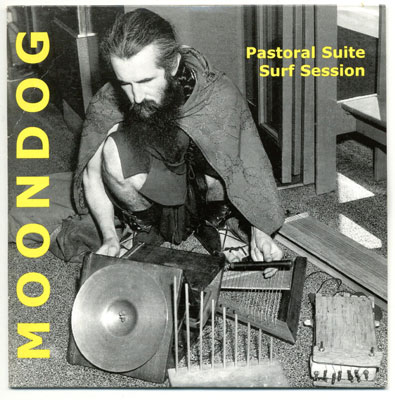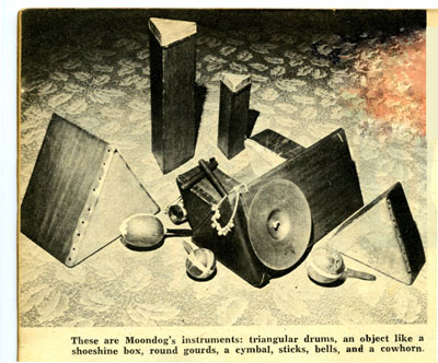 These are Moondog's instruments: Triangular drums, an object like a shoeshine box, round gourds, a cymbal, sticks, bells, and a cowhorn. One original creation is the trimba, a series of ten drums, triangular in shape, used in graduated sizes. Moondog has used the trimba in recordings to introduce rhythms of snaketime. (in: Moondog, People Magazine, March 7, 1956) |