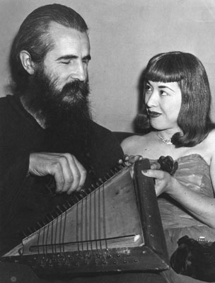 Photo: Moondog and his wife Suzuko, Philly,1955 … the "oo," a triangular 25-stringed harp, … (in: Records: Moondog, by John Briggs, NY Times, 1953) What's an oo? "A harp-like affair with a triangular frame and sounding board; it can be tuned anyway I like - happen to be pentatonic at the moment, but I change it often. It's played with claves, using a teeter-totter technique that gives bounce; mostly offbeat playing against drums' onbeat playing." (in: Oo, That Frantic Snaketime, by Leonard Feather, Downbeat, July 1,1953) His wife ran a thumbnail across a homemade harp of wooden quarter-inch dowels instead of strings and produced an uncanny but musical sighing sound. (in: 'Moondog' in Debut, by Paul V. Beckley, NY Herald Tribune, 1953) Moondog was playing, with his right hand, a percussion instrument of his own devising, and with the other, an equally unusual stringed instrument, which he calls an "Oo." The stringed instrument is an equilateral triangle with piano strings uned to a seven-note scale with two augmented seconds. Moondog played it with a clavis, a wooden affair not unlike a pharmacist's pestle. (in: Moondog's Euphonies, by Jack O'Brian) |